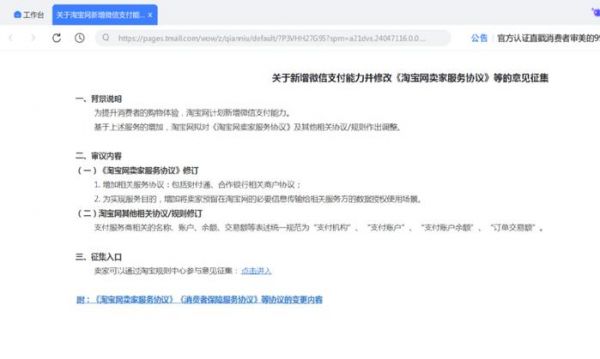 淘宝卖家端千牛平台近日宣布了一项旨在显著提升消费者购物体验的重大举措——计划全面引入微信支付功能,并明确表示此调整将在广泛征求业界意见后,正式对全体淘宝及天猫商家生效。