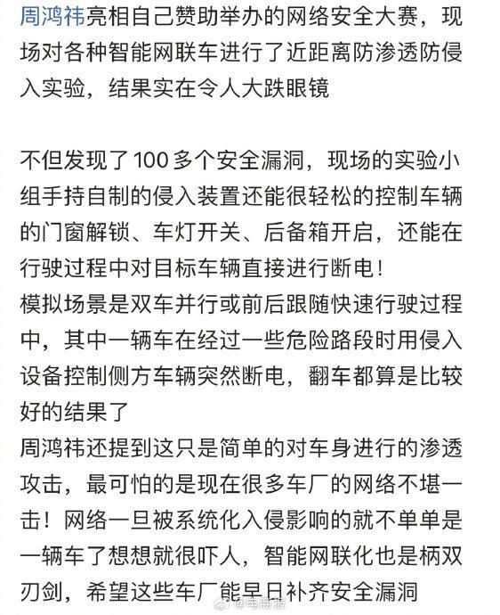 网址: 周鸿祎测试智能网联车安全,黑客研发的渗透设备,能直接打开车窗甚至断电… http://www.xishuta.cn/newsview124893.html