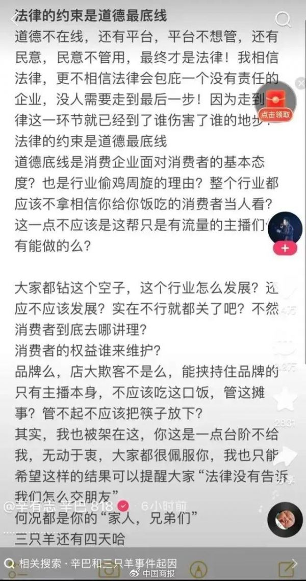 辛巴还表示:“大家都钻这个空子,这个行业怎么发展?还应不应该发展?实在不行就都关了吧?不然消费者到底去哪儿讲理?消费者的权益谁来维护?品牌吗,店大欺客不是吗,能挟持住品牌的只有主播本身,不应该吃这口饭,管这摊事?管不起不应该把筷子放下?其实,我也被架在这儿,你这是一点台阶不给我,无动于衷,大家都很佩服你,我也只能希望这样的结果可以提醒大家‘法律没有告诉我们怎么交朋友’,何况都是你的‘家人,兄弟们’。”