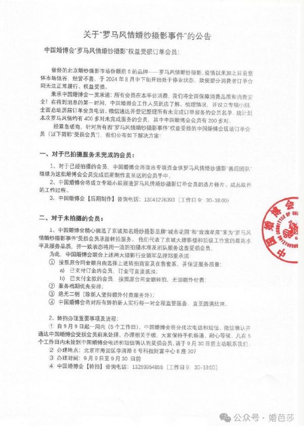 公告中称:罗马风情婚纱摄影因整体市场低谷,经营不善,于2024年8月中下旬开始处于停业状态,致使部分消费者订单合同无法正常履行、权益受损。目前中国婚博会工作人员到店了解、梳理情况,并设立专项小组,全面启动历届订单会员电话、微信通达并登记整理所有未完成订单服务的会员名单。