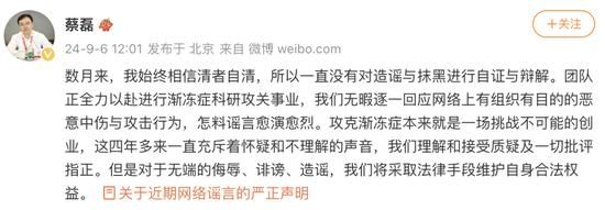 蔡磊团队表示,攻克渐冻症本来就是一场挑战不可能的创业,团队理解和接受质疑及一切批评指正,但对于无端的恶意侮辱、诽谤、造谣,将采取法律手段维护自身合法权益。