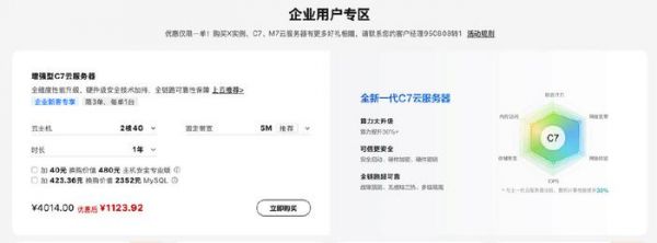 以购买一台增强型C7云服务器为例,该产品具有全维度性能升级、硬件级安全技术加持和全链路可靠性保障的优势,配置为2核4G,固定带宽5M,时长1年,原价4014元,叠加上企业新客专享优惠后仅需1123.92元,加40元又能换购价值480元主机安全专业版,加423.36元则可换购价值2352元的MySQL,性价比可谓突破了天际。