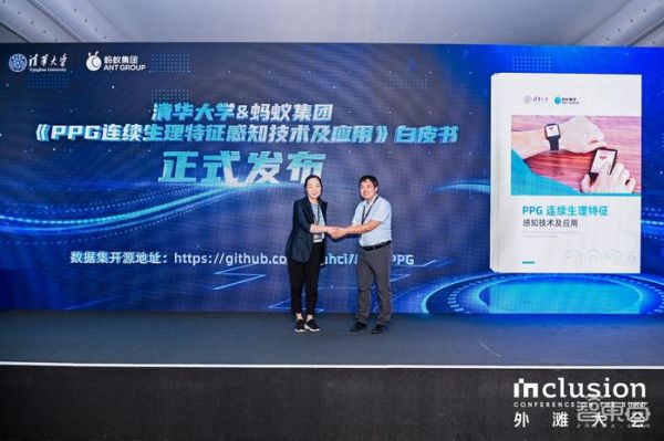 (图:清华大学教授、青海大学校长史元春与蚂蚁集团副总裁李俊奎联合发布白皮书)此次论坛上还发布了由清华大学、蚂蚁集团联合编制的《PPG连续生理特征感知技术及应用》白皮书,并宣布开源一批基于心跳识别身份的数据集。