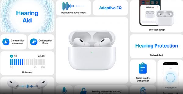 本场发布会上,苹果宣布后续将对AirPods进行一次“史诗级的软件更新”:其更新后的新增功能包括听力保护、听力测试,甚至还支持临床等级的助听器功能。