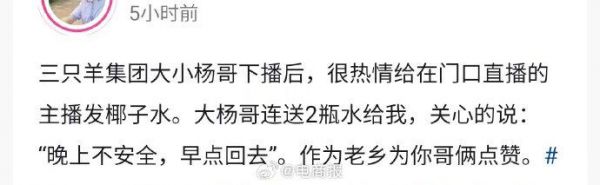 小杨哥和大杨哥下播后,给三只羊门口的流量的主播发水喝,主播连连点赞