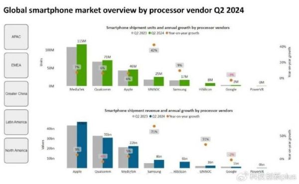 而从2024年二季度数据来看,联发科是大哥,一个季度出货量就高达1.15亿颗,再是高通、苹果、紫光展锐、三星、华为海思、谷歌。