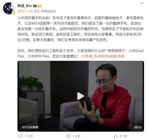 1月23日午后,小米联合创始人兼时任总裁林斌在微博上发布了一个视频,宣布小米攻克了柔性折叠屏技术、四驱折叠转轴技术、柔性盖板技术等一系列难题后,做出第一台双折叠手机。他特意声明,这是一台工程机,只是发出来给大家看看,将会根据大家的喜爱程度考虑是否做成量产手机。