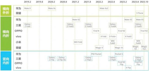 OPPO、vivo和小米,也属于第二梯队。它们与荣耀类似,多在2021-2022年间才发布首款折叠屏产品。此后,它们每年更新1-2款,且只有内折和竖折产品,相对保守。