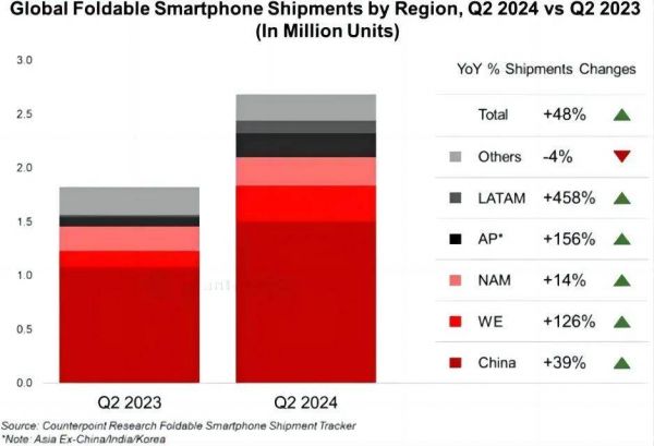 只有大厂有能力搅动更强烈的风暴。如今,以华为为代表的中国手机厂商,正在全球折叠屏市场扮演更重要的角色。市场研究机构Counterpoint Research在最近发布的报告显示,全球折叠屏智能手机在2024年第二季度同比增长48%,其中,中国品牌持续引领增长,占总出货量超过一半。