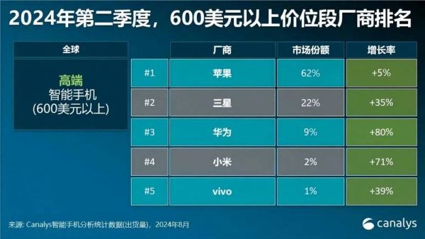 研究机构Canalys数据显示,2024年二季度,全球高端智能手机市场(600美元以上)出货量前五的厂商均实现了同比增长。苹果、三星、华为分别以62%、22%、9%的市场份额位居前三。