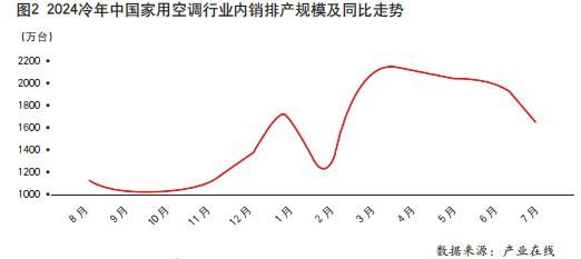 因此,在2024空调冷年启动伊始,空调内销出货就保持着极高的热度,即使“双11”零售端肉眼可见的需求低迷,也没能阻止空调企业向内销渠道大量出货。这一局面一直持续到今年6月,在零售渠道销售低迷、渠道库存创下新纪录之后,是内销排产规模断崖下滑的两个月(见图2)。