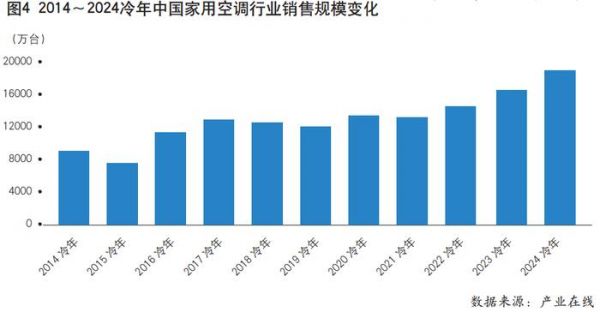 空调出口超出预期的猛增,保证了2024冷年中国家用空调产业的基本盘。产业在线数据显示,2024冷年,中国家用空调总销量为1.85亿台,同比增长10.6%,规模再次创下历史纪录(见图4)。