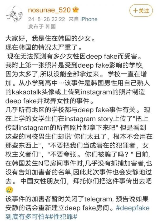 韩国“N 号房”事件因 Deep Fake 再现,受害者向中国网友求救