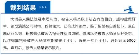 部分违规订单还可能承担法律后果。7月,据广东省高级人民法院通报,网约车司机杨某虚假下单、接单,“空跑”骗取平台垫付车费8379.36元,构成诈骗罪,被判处有期徒刑七个月,缓刑一年四个月,并处罚金5000元。