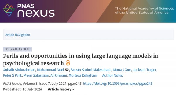 ▷Abdurahman,Suhaib,et al."Perils and opportunities in using large language models in psychological research."PNAS nexus3.7(2024):pgae245.