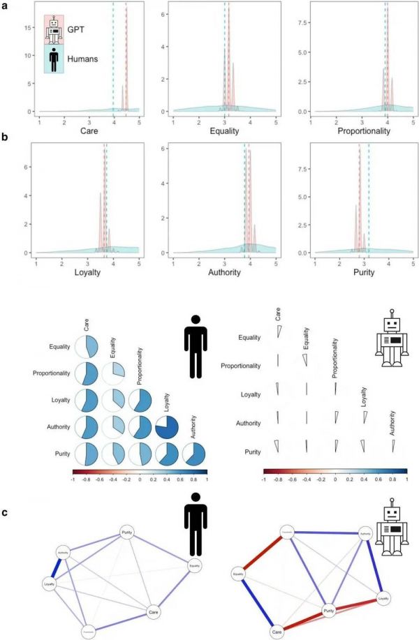 ▷ChatGPT与人类道德判断。注:a)人类道德判断(浅蓝色)和GPT(浅红色)在六个道德领域的分布。虚线代表平均值。b)人类道德价值观之间的相互关系(=3902)和ChatGPT问答(=1000)。c)基于来自19个国家(30)的不同人类样本和1000个GPT问答的道德价值观之间的部分相关网络。蓝色边缘表示正偏相关,红色边缘表示负偏相关。