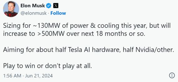 “要么就赢,要么就别玩(Play to win,or don't play at all)。”马斯克6月的一条X信息是对其野心的最好诠释,而他更具体的计划是在今年12月前训练出“按每项指标衡量都是世界上最强大的人工智能。”