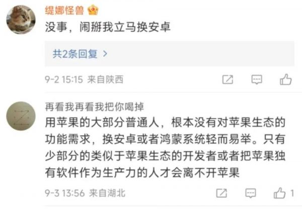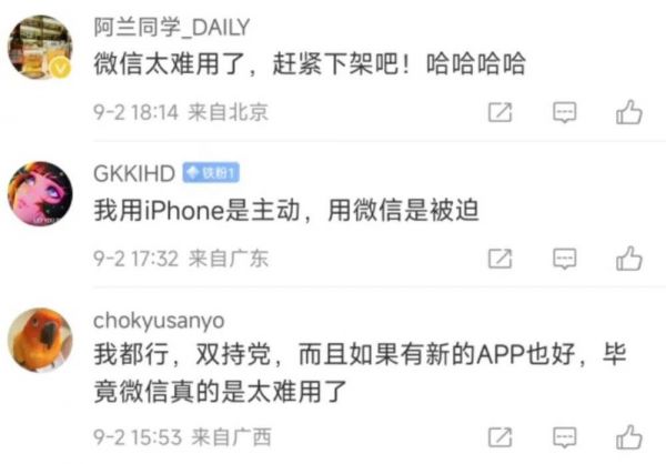 而支持苹果的人认为,微信只是一个集各种功能于一体的集合体,但实际上,它的每一个功能都可被替代。任何小程序在支付宝里都可以有,收付款用支付宝或者银行软件都可完成,至于线上沟通,抖音小红书淘宝飞书钉钉QQ甚至FaceTime短信,几乎什么软件都随时准备取代微信。苹果不是信仰,只是一个简单的金钱成本。微信不是生活,而只是一个信息集中营。