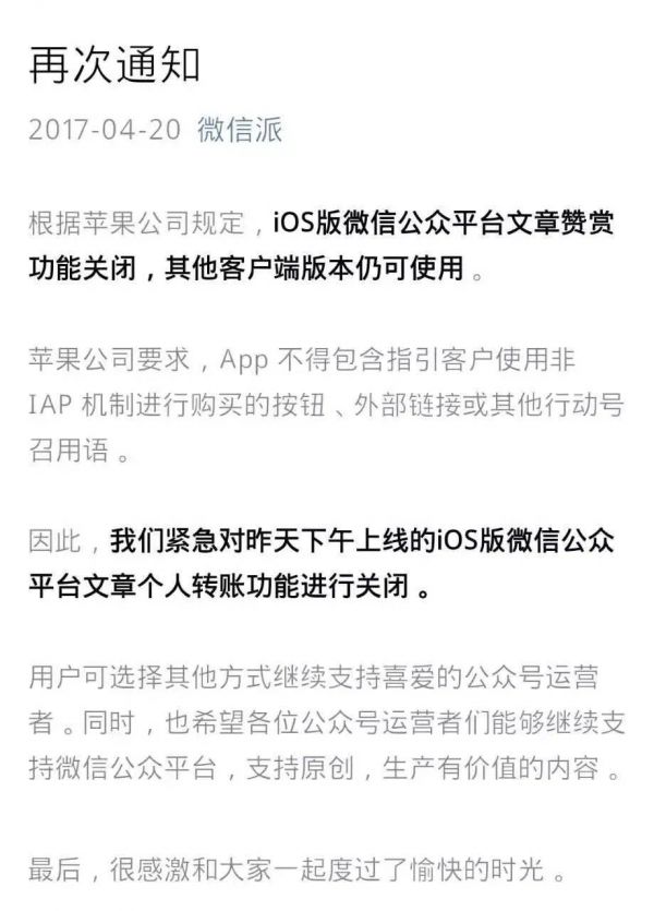 2017年,微信发明文章打赏功能。苹果要按30%的比例抽成文章打赏,微信拒绝,直接谈崩,微信主动关闭iOS版的打赏功能。最终此事以苹果妥协告终,2018年6月6日,微信恢复iOS端的文章打赏功能。