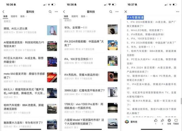 (图片来源:雷科技MCN,雷科技微信真实粉丝195万,矩阵粉丝超过300万)IFA100专题报道除分发在拥有300万+粉丝的自有微信矩阵外,还得到包括36kr在内的重要垂直门户的重磅推荐。在百度搜索“IFA”相关关键词,雷科技内容均出现在首位/前列;在36kr搜索“IFA”,绝大部分内容来自雷科技。