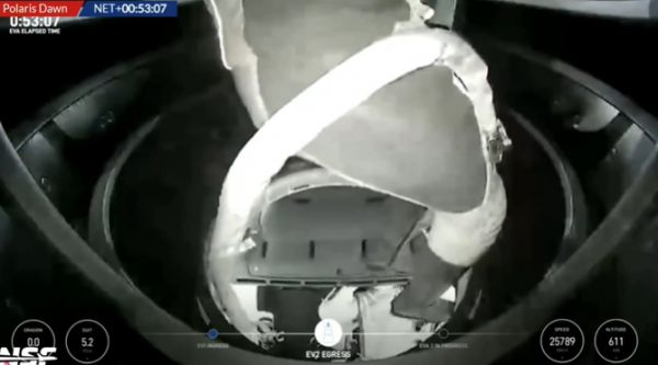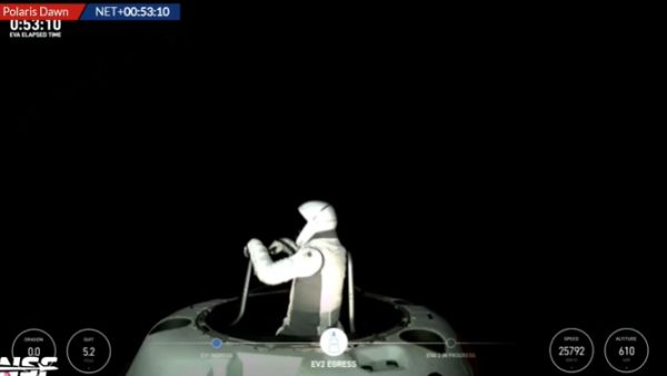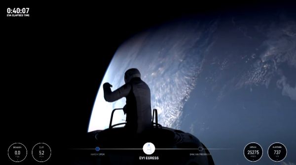 他借助被SpaceX命名为“天行者”的扶手,小心翼翼地通过“龙”飞船顶部的舱门。为了安全起见,他始终保持一只手或脚停留在飞船外壁类似梯子的支撑结构上,还有一根3.6米长的安全绳将他与飞船相连,且不同于以往宇航员飘出国际空间站相当距离的太空行走,艾萨克曼并没有在绳子末端悬停,只是探出了大半个身子,在船首附近有限活动,而非整个身体出舱,其出舱时间只有短短的10分钟。