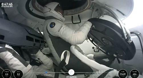 另外两名机组人员留在太空舱中管理为出舱者提供氧气和电力的安全绳,并监测显示屏数据,以确保安全。不同于较大的航天器,“龙”飞船没有气闸舱,因此,打开舱门后,整个船舱都处于失压环境中,留在舱内的宇航员也会在 2 小时的任务周期内暴露于真空环境,所以他们在等待出舱同伴期间也穿着舱外活动太空服。