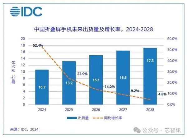 9月11日,市场研究机构IDC今日发布了2024年上半年中国折叠屏手机市场各品牌厂商的份额,华为以42.7%份额位居第一。IDC还预测2024年全年中国折叠屏手机市场出货量约1,068万部,同比增长52.4%。预计到2028年,中国折叠屏手机市场出货量将会超过1,700万部,五年复合增长率达到19.8%。