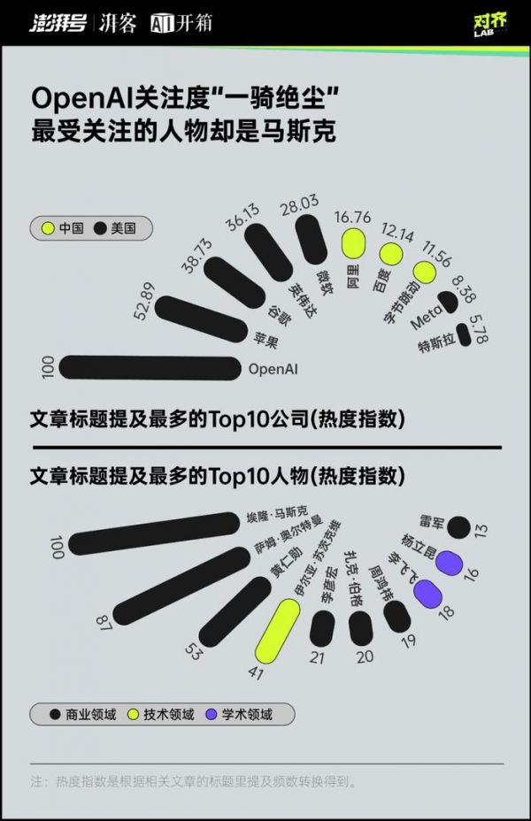阿里巴巴、百度、字节跳动 3 家中国公司也在标题提及最多的前 10 里,腾讯紧随其后,排在第 11 位。这些传统的互联网巨头企业铆足了劲卷 AI,谁也不想在 AI 时代落后。