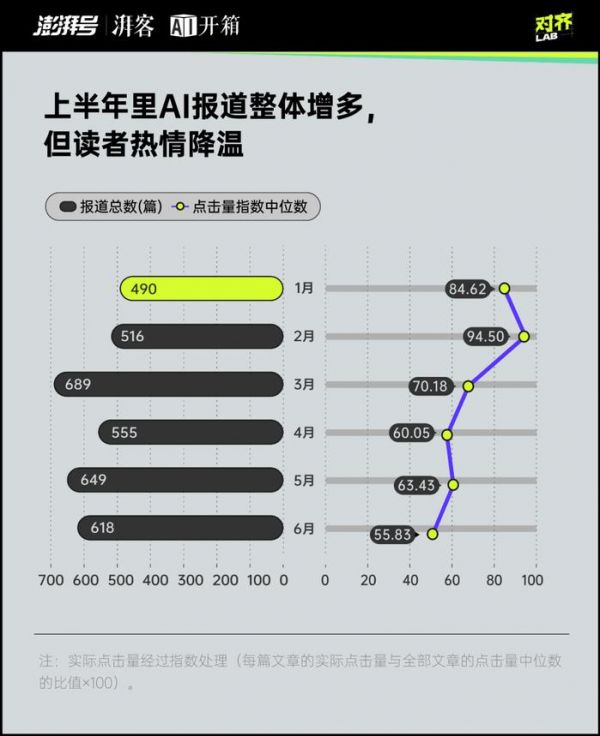 但 AI 上半年的高光时刻也结束在 2 月。此后 4 个月间,都再没有任何技术产品能像 Sora 一样出圈。创作者对 AI 报道的热情还在上涨,但读者的热情“退潮”已经先一步出现——整体点击量明显下滑,6 月的点击量指数中位数几乎只有 2 月的一半。