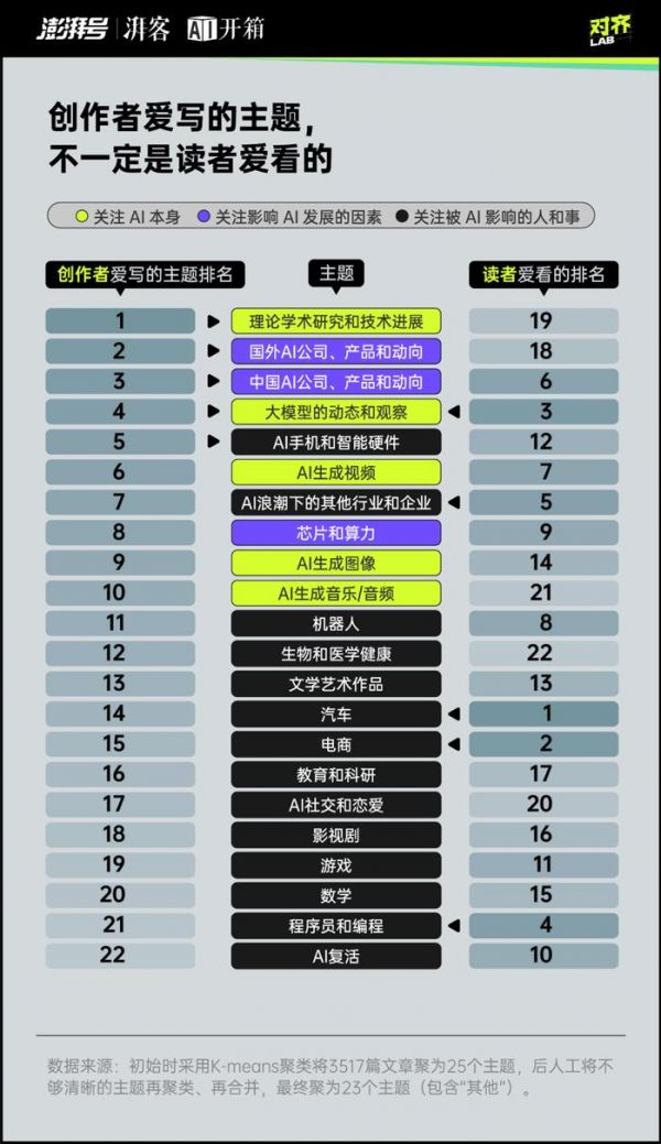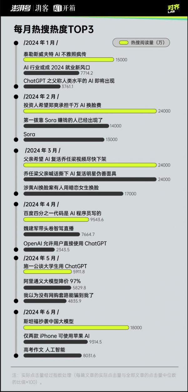 湃客·AI 开箱联合澎湃新闻·对齐 Lab 推出的《人工智能新媒体内容传播力洞察报告》,基于湃客平台 2024 上半年 3517 篇有关 AI 的报道分析发现,第一名几乎是理所当然的, 第二名的结果则值得细品。
