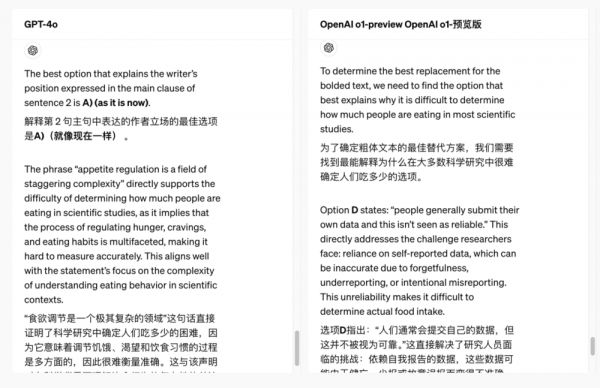 在OpenAI给的案例中。GPT-4o和o1模型同时回答同一个问题——读一段长文,然后做阅读理解。在o1模型中,会多一个选项叫做展开思维链。