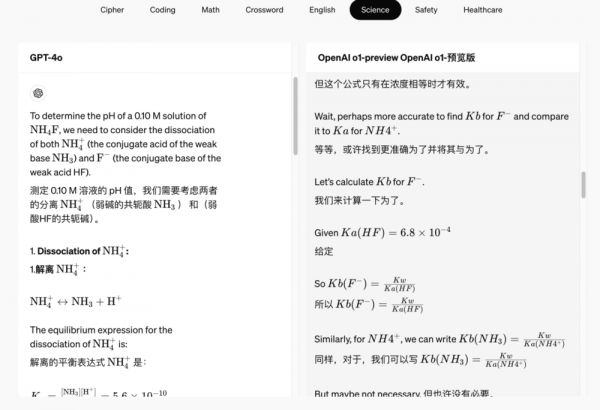 而在另一个例子中,解决化学问题时,我们可以看到o1模型甚至自己在选择多种方案对比。