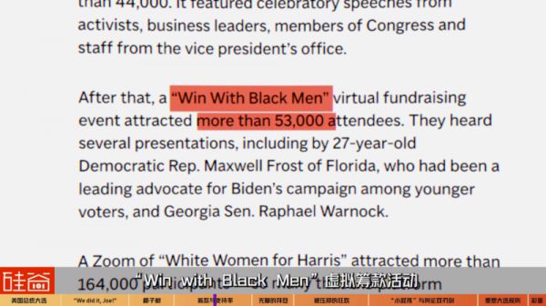 类似的,Win with Black Men虚拟筹款活动吸引了超过 53,000 名参会人,“White Women for 哈里斯“的线上活动吸引了超过 164,000 名参与者,人数太多一度差点让线上会议平台Zoom难以满足更多人数的需求。