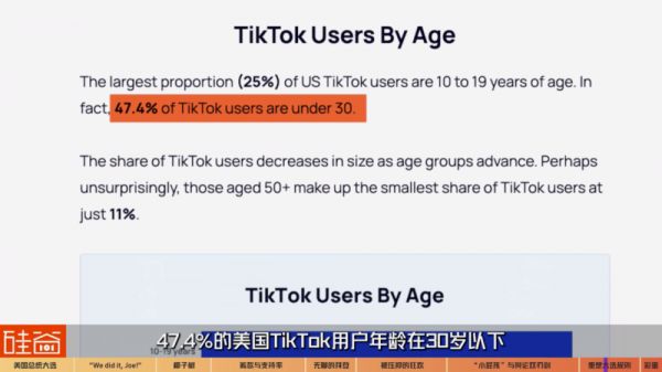 而随着美国大选战火转移到互联网上,年轻人们的声音变得愈发重要,在Tikok上,47.4%的美国TikTok用户年龄在30岁以下。