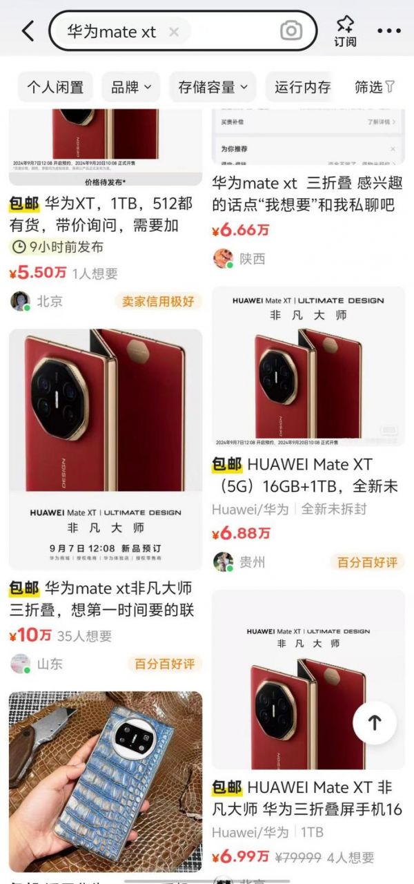 在一些电商平台上,华为Mate XT被炒到了天价。在正式发布前,新浪科技在闲鱼上看到,不少卖家就提前发布了华为Mate XT的售卖链接,开启溢价预售,标价少则两三万元,多则近十万元。比如一位标价6.88万元的卖家表示,“本人多个渠道在抢,总会拿到一台,有需要的联系。”还有人标价10万元,甚至数十万元,不过如此标价有蹭热度嫌疑。