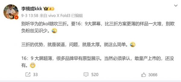 但三折叠究竟会带来多大的颠覆性使用场景,还有不同的观点。比如魅族前高管、怒喵科技创始人兼CEO李楠就在微博上表示,“别听华为的KOL瞎吹三折。要16:9大屏幕,比三折方案更薄的样品一大堆,别欺负粉丝见识少。三折的优势,就是装逼,问题,就是太厚。就这么简单。16:9 大屏超薄,很多品牌早有原型展示。当然必须承认,敢量产上市的,还没有。”
