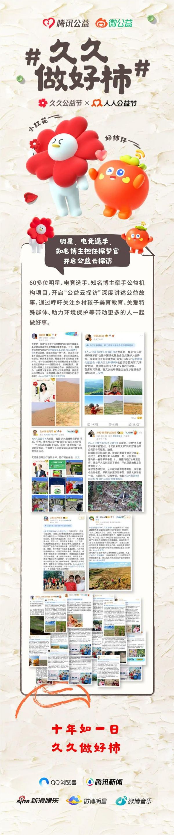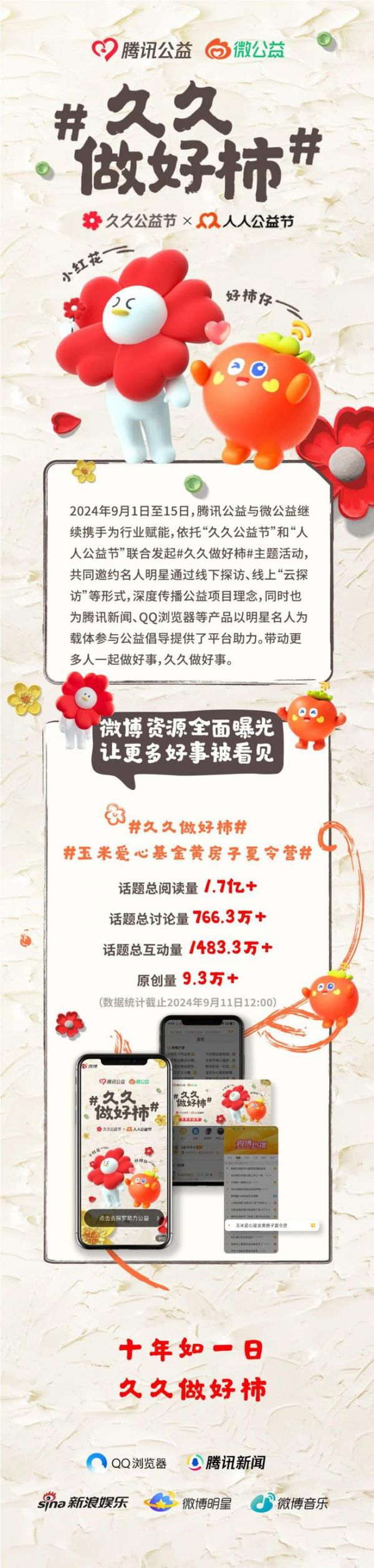 9月1日至15日期间,腾讯公益和微公益继续携手,依托“久久公益节”和“人人公益节”联合发起了#久久做好柿#主题活动。去年9月,双方也曾做出过公益IP共建的尝试。