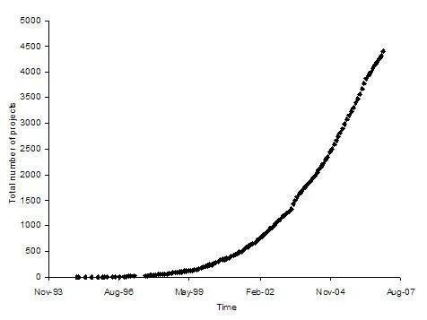 开源项目总数。摘自 2008 年 Amit Deshpande 和 Dirk Riehle 出版的《The Total Growth of Open Source》