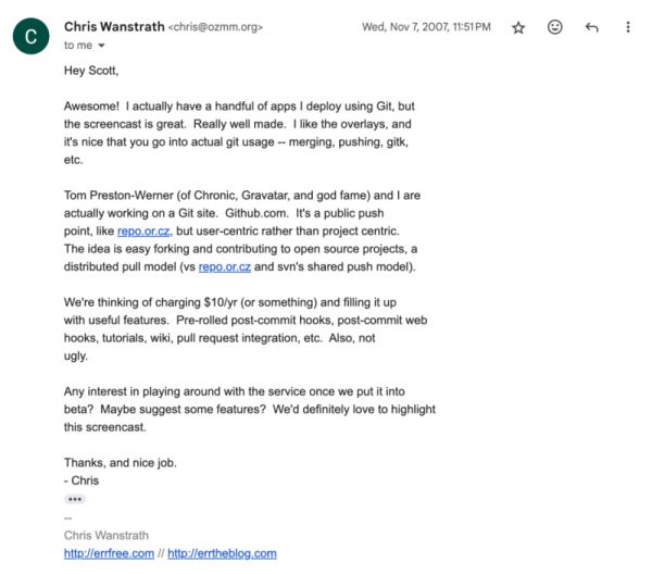 我翻了翻旧邮件,想看看我第一次听说 Tom 的 “GitHub” 项目是啥时候。发现是 Chris 在 2007 年底回复我 Git 视频教程的邮件。