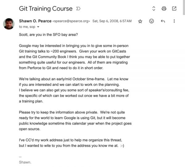 2008 年 9 月初,就在 Android 1.0 发布前夕(大约是这封邮件发出两周后,也是在我做培训之前),Git 生态系统的早期英雄之一 Shawn Pearce 给我发了封邮件,邀请我帮忙培训 Google Android 团队使用 Git。