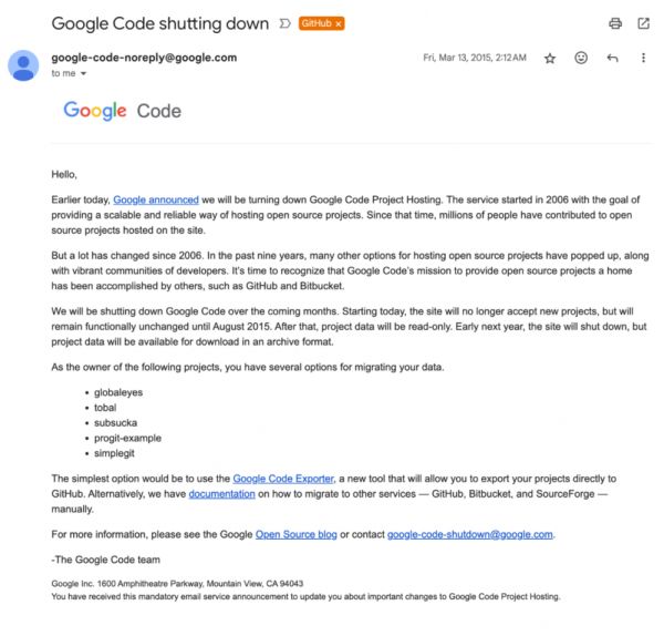 仅仅 4 年后,2015 年,Google Code 彻底退出了历史舞台,关闭了服务。他们甚至在邮件里建议大家直接转移到 GitHub。如果我没记错的话,他们还联系了我们,寻求帮助进行迁移服务。