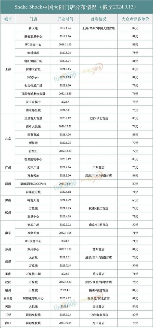 “联商网”统计了目前Shake Shack在内地已开业的门店情况。数据显示,截至今年9月13日,全国已经开业了37家门店,其中上海11家、北京6家、深圳和南京各3家、杭州和成都各2家,其余广州、佛山、苏州、重庆、武汉、福州、秦皇岛、天津、三亚、海口各家,一共分布在16个城市。