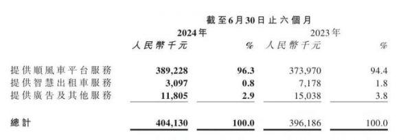 从半年报来看,嘀嗒出行的收入 96.3% 来自顺风车业务,余下的是 0.8% 的智慧出租车服务和 2.9% 的广告及其他服务。其中,智慧出租车的营收同比减少了 56.9%,广告及其他的收入同比减少了 21.5%,均为下降趋势。