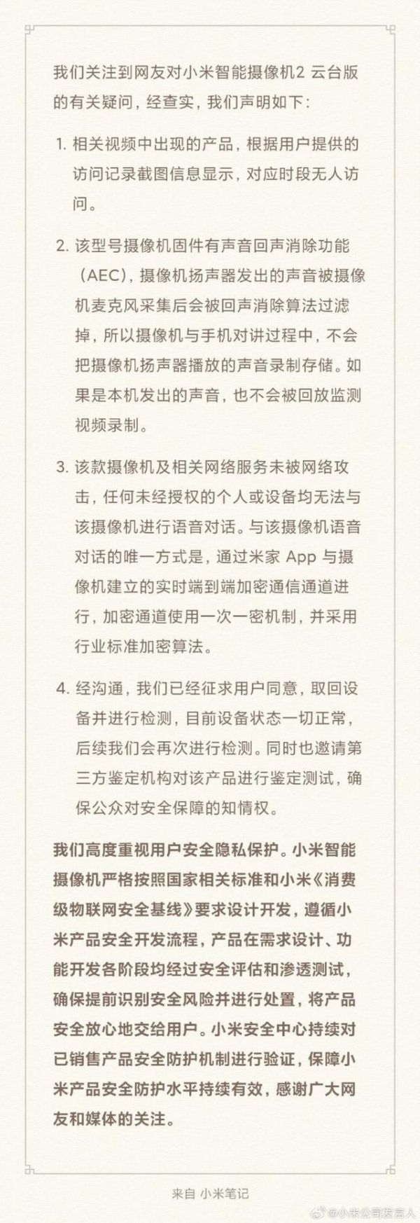 声明中明确指出,根据用户提供的访问记录截图信息,在视频中出现的对应时间段内,并未有任何外部访问记录。此外,小米强调该摄像头及其相关网络服务并未遭受网络攻击,且不存在任何未经授权的个人或设备能够与之进行语音对话的可能性。唯一能够与该摄像机进行语音对话的方式,是通过米家App建立的实时端到端加密通信通道,该通道采用一次一密机制及行业标准加密算法,确保通信安全。