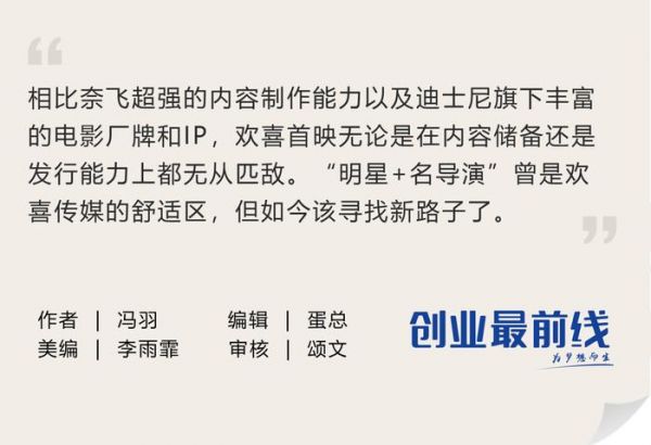 但是相比奈飞超强的内容制作能力以及迪士尼旗下丰富的电影厂牌和IP,欢喜首映无论是在内容储备还是发行能力上都无从匹敌。