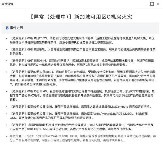据阿里云官方发布的公告显示,火灾发生在当日上午8时左右,由于锂电池的爆炸,新加坡地域可用区C的数据中心迅速被大火吞噬。随着火势的蔓延,火灾对机房的物理破坏逐渐加剧,给灭火工作带来了巨大挑战。尽管新加坡消防部门迅速响应,调集了大量消防力量前往现场进行扑救,但截至火灾发生后的30多个小时,火势仍未被完全控制。