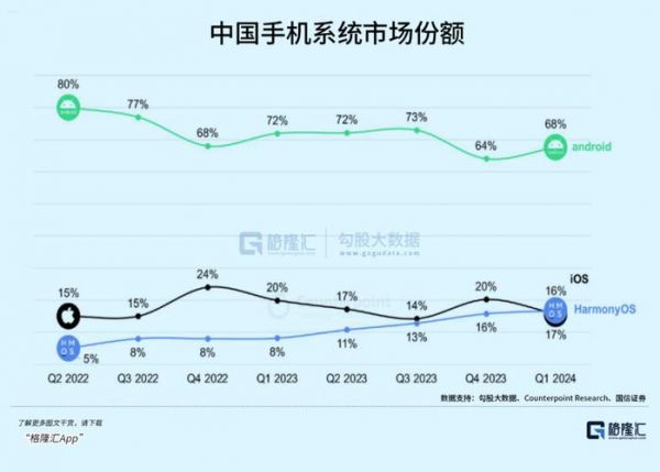 2024上半年,华为手机在中国市场出货量为2220万台,同比+55.2%,市占率16.1%;搭载鸿蒙操作系统的手机出货量同比+66.7%,市场份额提升至17.2%,挤掉了iOS,仅次于安卓。