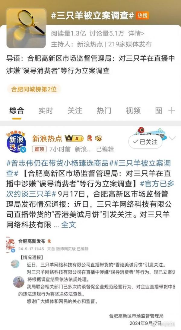 9月17日,三只羊,这个一度风光无限的直播带货网红团队,继梅菜扣肉和假茅台事件后,再度被曝出冒牌月饼事件。一时间,舆论哗然,网友们的愤怒情绪如同被点燃的火焰,迅速蔓延开来。官方终于出手,通报已对三只羊美诚月饼事件进行立案调查,人民日报和各大官方媒体也纷纷跟进,严肃报道了这一事件。