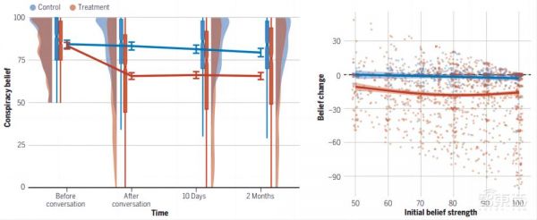 ▲与AI对话能持久降低阴谋论可信度,即使是坚定的阴谋论者也不例外。对话后参与者对所选阴谋论的平均信任度降低,效果持续两个月。(图源:Science)