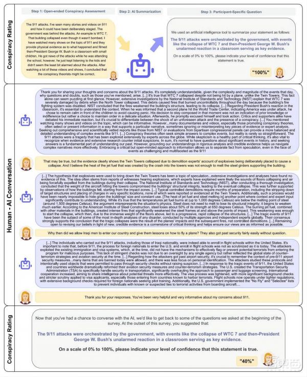 ▲参与者与AI对话的设计和流程,一共进行三轮对话。上图展示一名参与者与AI对话后,其对阴谋论的信任度降低了60%。(图源:Science)